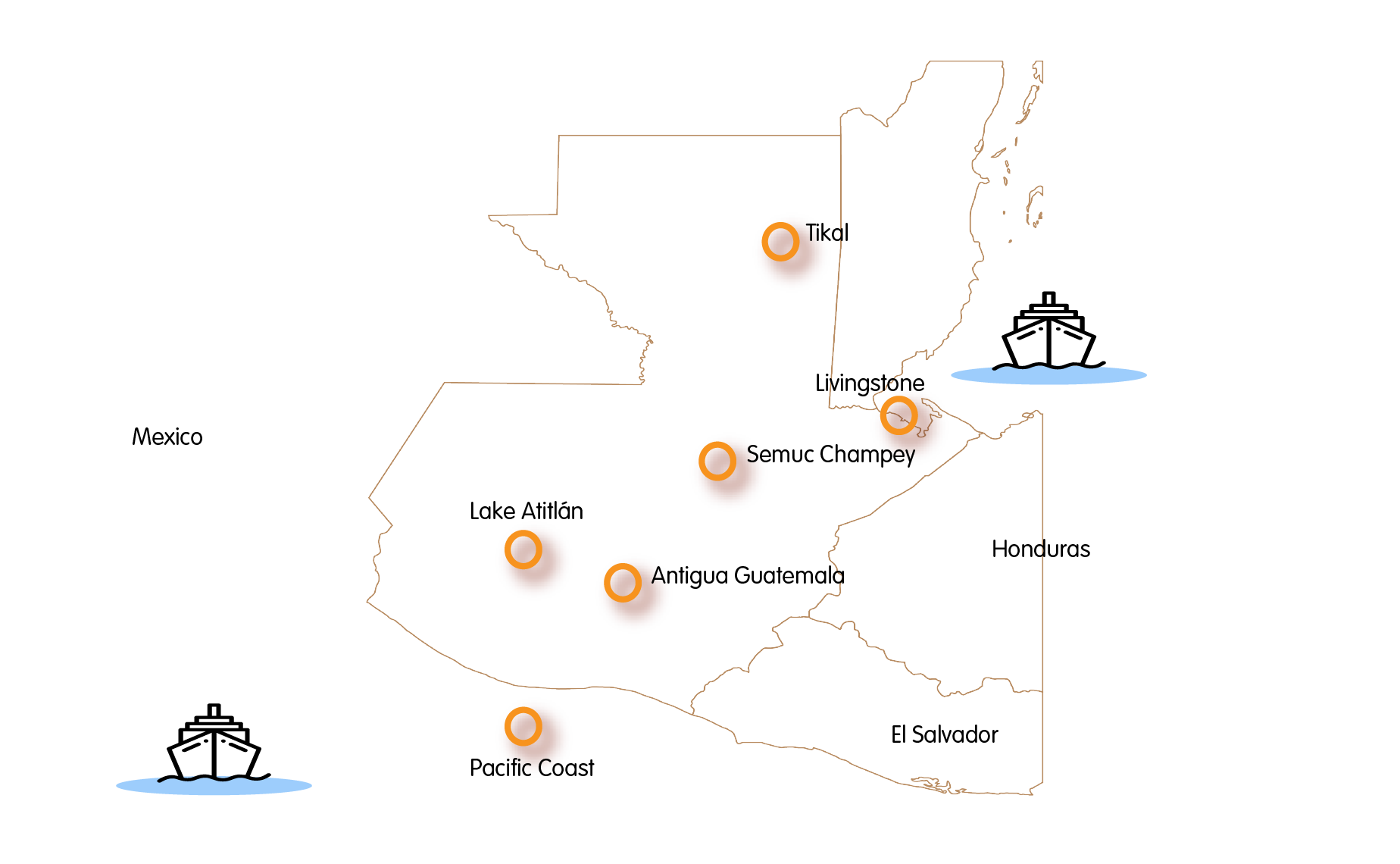 From the Pacific mangroves of El Parédon to the Caribbean Castillo San Felipe, and from the peak of Acatenango (one of the largest of our 32 volcanoes) down to the bottom of Atitlán, Guatemala’s energy resonates through 17 million people, 23 indigenous groups, and six distinct languages. With a whole host of UNESCO protected sites, lush jungles, bustling artisan markets, and honored Holy Week processions, our Guatemala is brimming with adventures, experiences, luxury, and learning.